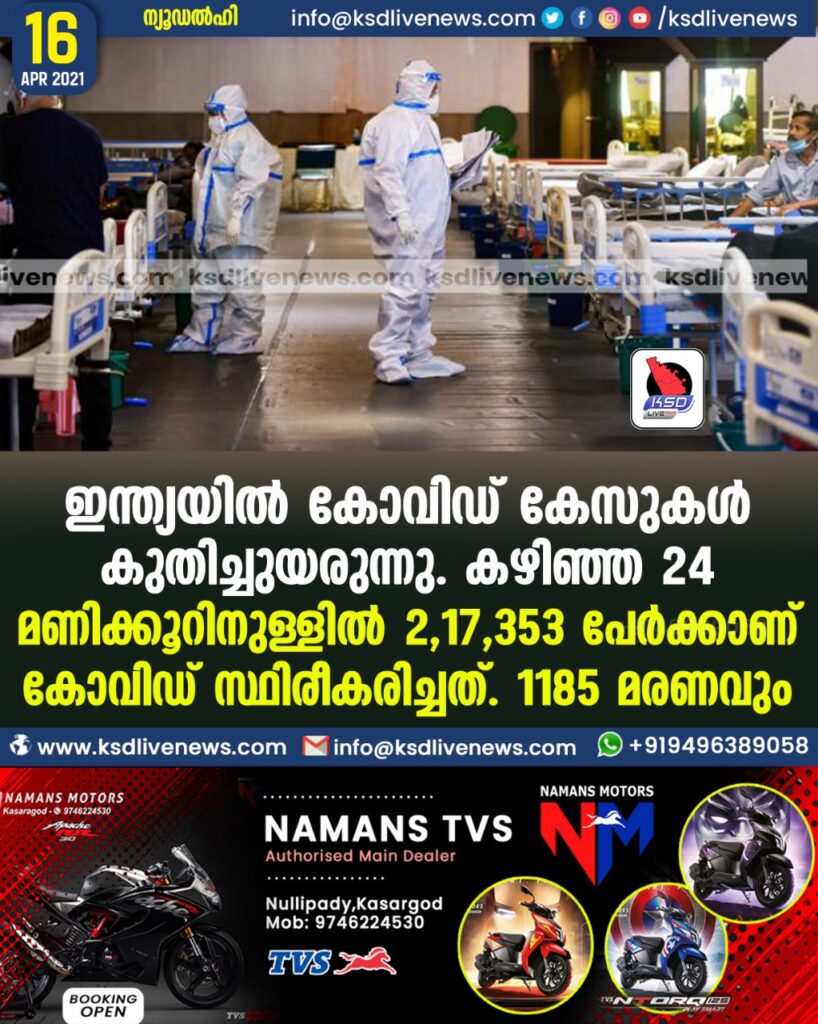 ഇന്ത്യയിൽ കോവിഡ് കേസുകൾ കുതിച്ചുയരുന്നു. കഴിഞ്ഞ 24 മണിക്കൂറിനുള്ളിൽ 2,17,353 പേർക്കാണ് കോവിഡ് സ്ഥിരീകരിച്ചത്. 1185 മരണവും