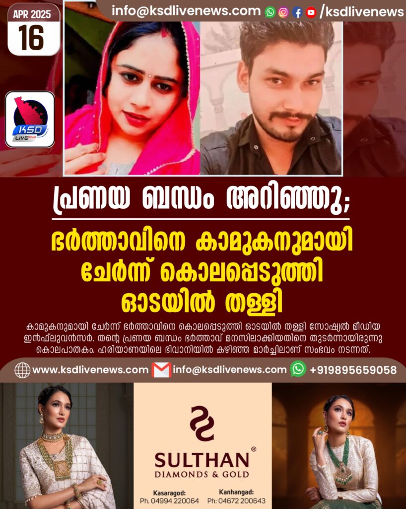ഹരിയാണയിലെ ഭിവാനിയില് കഴിഞ്ഞ മാർച്ചിലാണ് കേസിനാസ്പദമായ സംഭവം നടന്നത്. സോഷ്യല് മീഡിയ ഇൻഫ്ലുവൻസറായ രവീണയാണ് ആണ്സുഹൃത്തായ സുരേഷുമായി ചേർന്ന് ഭർത്താവ് പ്രവീണിനെ കൊലപ്പെടുത്തിയത്.