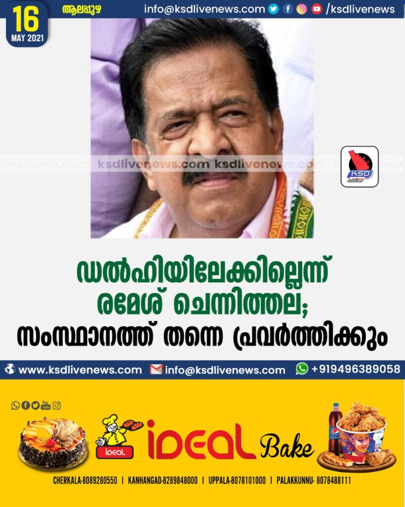 ഡൽഹിയിലേക്കില്ലെന്ന് രമേശ് ചെന്നിത്തല സംസ്ഥാനത്ത് തന്നെ പ്രവർത്തിക്കും
