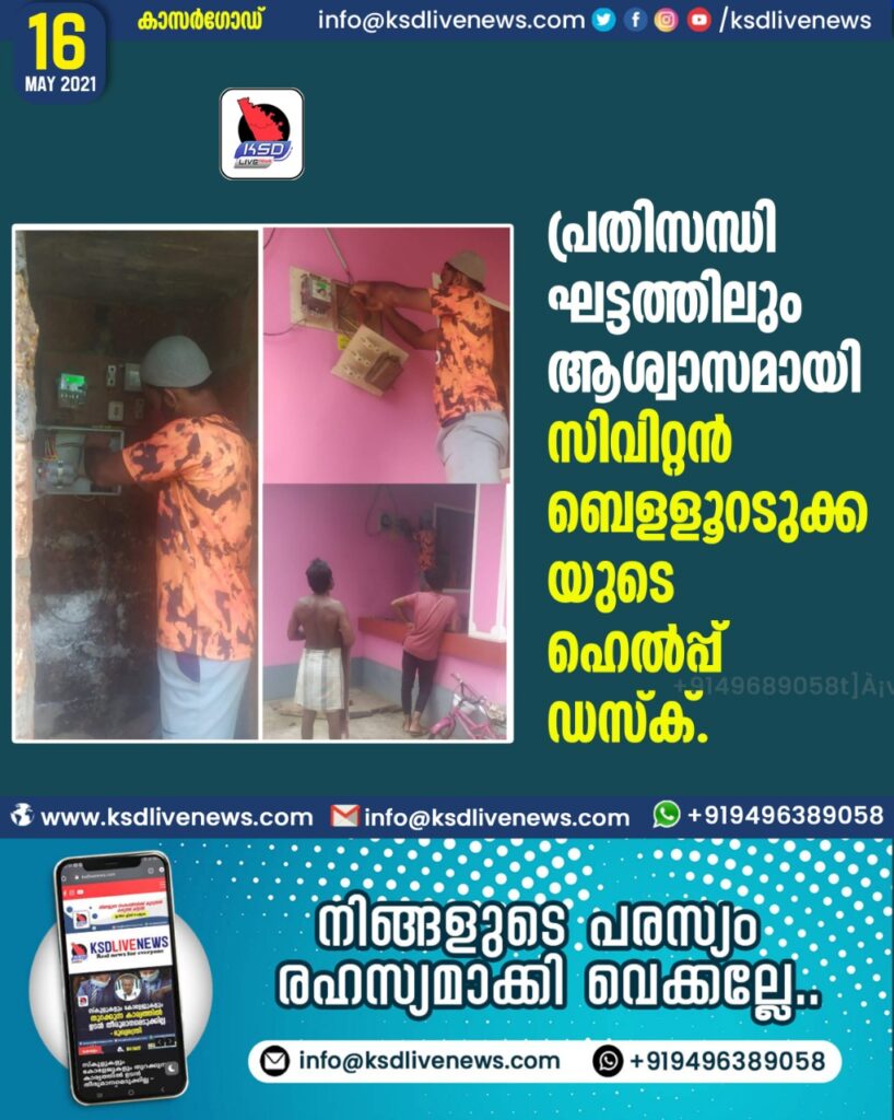 കഴിഞ്ഞ ദിവസങ്ങളിൽ ശക്തമായ ഇടമിന്നലിൽ തകർന്ന ബെള്ളൂറടുക്ക പ്രദേശത്തേ വീടുകളിലെ വൈദ്യുതി ഉപകരണങ്ങൾ സിവിറ്റൻ ആർട്സ് & സ്പോർട്സ് ക്ലബ് ബെള്ളൂറടുക്കയുടെ ഹെൽപ്പ് ഡസ്കിന്റെ നേതൃത്വത്തിൽ നന്നാക്കി. ഹെൽപ്പ് ഡസ്ക് അംഗങ്ങളായ അഫ്സൽ, ഷരീഫ് തുടങ്ങിയവർ നേതൃതം നൽകി.