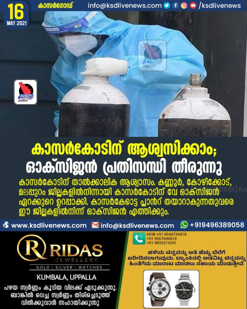 കാസര്കോടിന് ആശ്വസിക്കാം; ഒാക്സിജന് പ്രതിസന്ധി തീരുന്നു