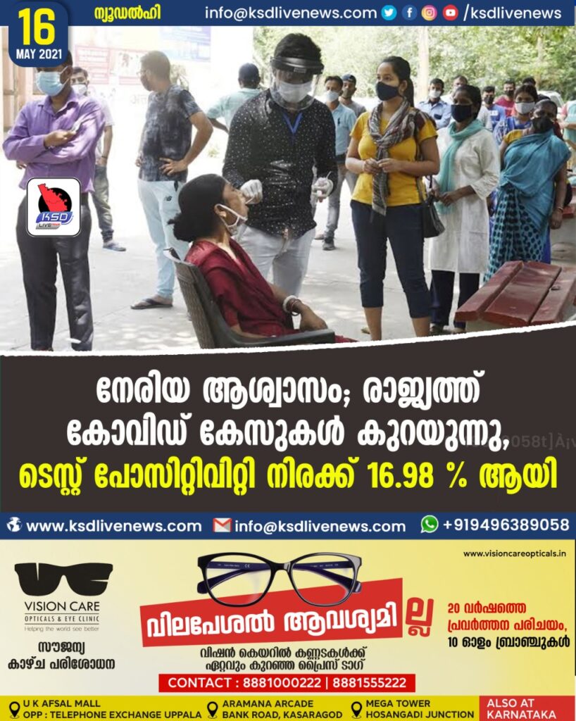 നേരിയ ആശ്വാസം; രാജ്യത്ത് കോവിഡ് കേസുകള് കുറയുന്നു, ടെസ്റ്റ് പോസിറ്റിവിറ്റി നിരക്ക് 16.98 % ആയി