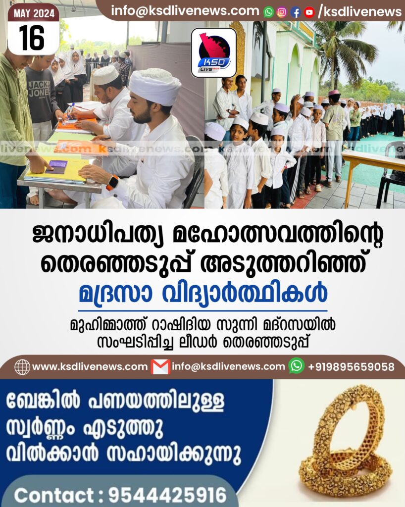നെല്ലിക്കട്ട : മുഹിമ്മാത്ത് റാഷിദിയ സുന്നി മദ്റസ കുട്ടികളാണ് പൊതു തെരഞ്ഞടുപ്പ് മാതൃകയിൽ ലീഡർമാരെ തെരഞ്ഞടുത്തത്.