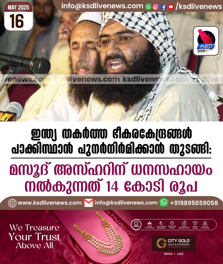 ഇന്ത്യ തകർത്ത ഭീകരകേന്ദ്രങ്ങൾ പാക്കിസ്ഥാൻ പുനർനിർമിക്കാൻ തുടങ്ങി: മസൂദ് അസ്ഹറിന് ധനസഹായം നൽകുന്നത് 14 കോടി രൂപ