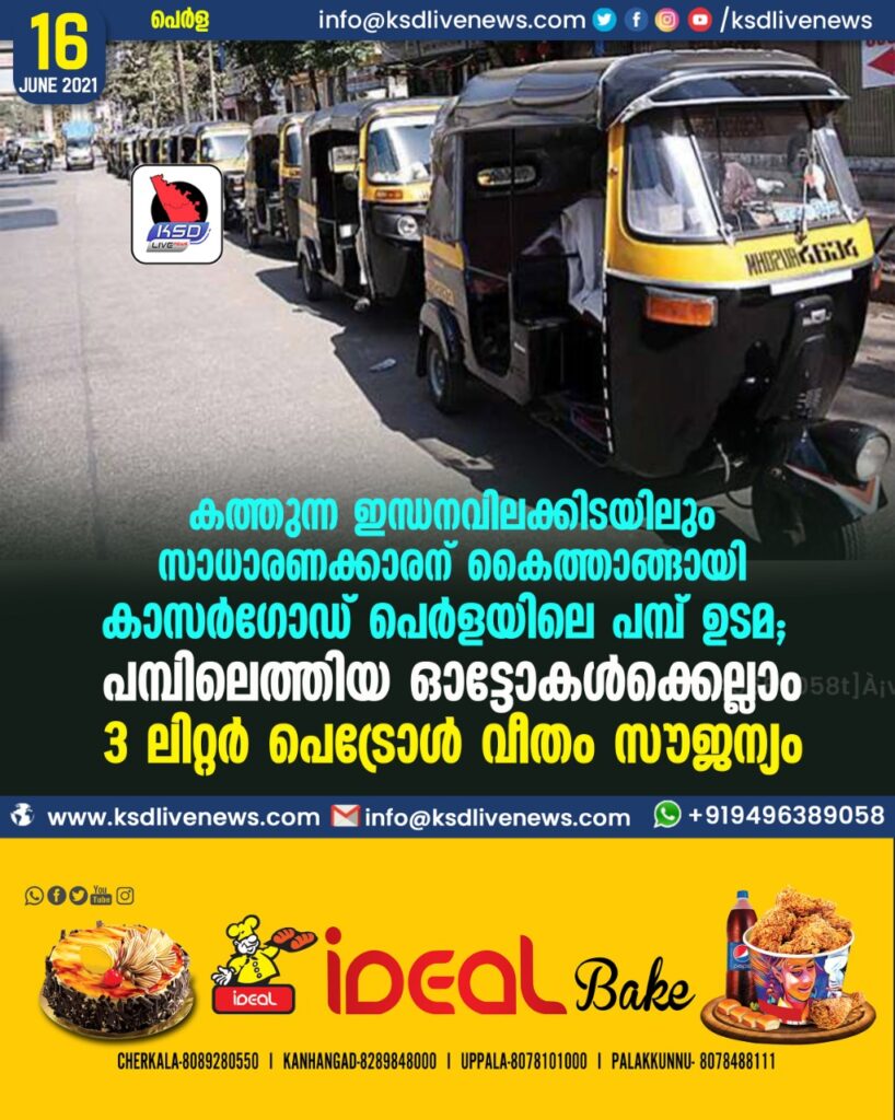 കത്തുന്ന ഇന്ധനവിലക്കിടയിലും സാധാരണക്കാരന് കൈത്താങ്ങായി കാസർഗോഡ് പെർളയിലെ പമ്പ് ഉടമ ; പമ്പിലെത്തിയ ഓട്ടോകള്ക്കെല്ലാം 3 ലിറ്റര് പെട്രോള് വീതം സൗജന്യംSHARE THIS ON