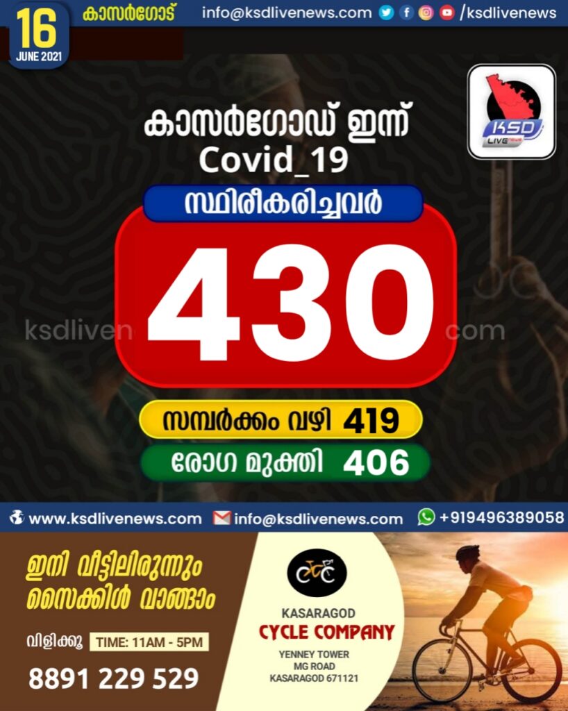 കാസർഗോഡ് ജില്ലയിൽ ഇന്ന് 430 പേർക്ക് കോവിഡ് സ്ഥിരീകരിച്ചു. സമ്പർക്കം വഴി 419 പേർക്കും. 406 പേർക്ക് രോഗമുക്തിSHARE THIS ON
