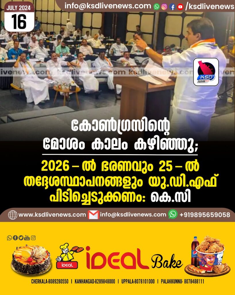 കോണ്ഗ്രസിന്റെ മോശം കാലം കഴിഞ്ഞു; 2026-ല് ഭരണവും 25-ല് തദ്ദേശസ്ഥാപനങ്ങളും യു.ഡി.എഫ് പിടിച്ചെടുക്കണം: കെ.സി