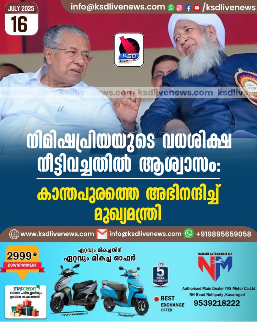 നിമിഷപ്രിയയുടെ വധശിക്ഷ നീട്ടിവച്ചതില് ആശ്വാസം; കാന്തപുരത്തെ അഭിനന്ദിച്ച് മുഖ്യമന്ത്രി
