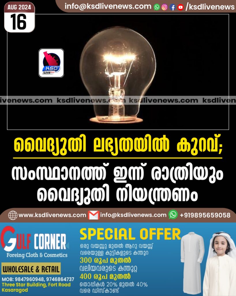 തിരുവനന്തപുരം∙ സംസ്ഥാനത്ത് ഇന്നും വൈദ്യുതി നിയന്ത്രണത്തിന് സാധ്യത. വൈദ്യുതി ലഭ്യതയിൽ 500 മെഗാവാട്ട് വരെ കുറഞ്ഞതാണ് കാരണം. രാത്രി 7 മുതൽ 11 വരെയുള്ള സമയത്ത് 15 മിനിറ്റ് വരെ വൈദ്യുതി നിയന്ത്രണം ഉണ്ടായേക്കാം.