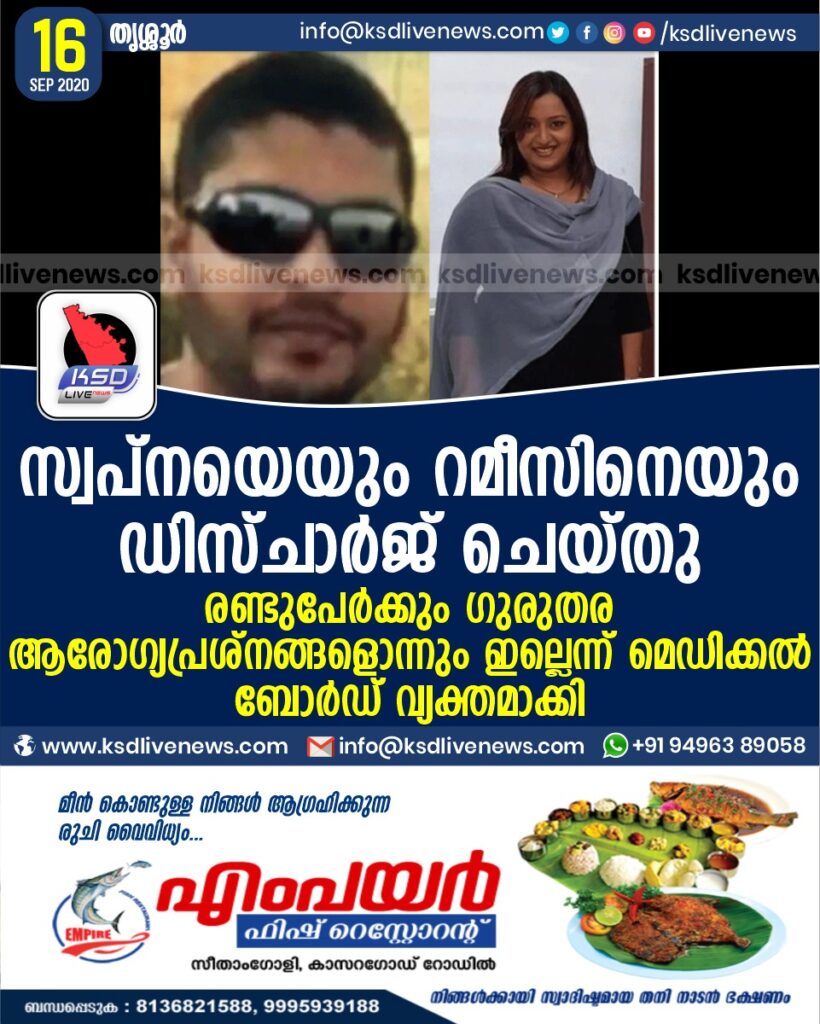 സ്വപ്നയെയും റമീസിനെയും ഡിസ്ചാര്ജ് ചെയ്തു