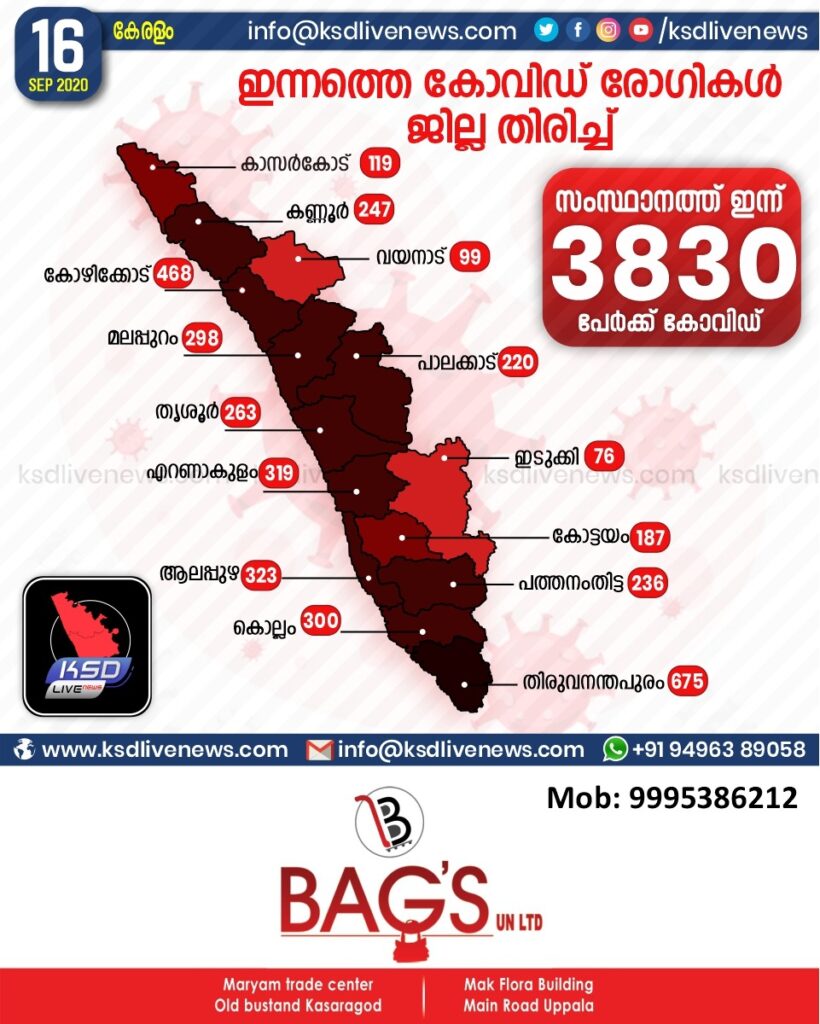 ഇന്ന് സംസ്ഥാനത്ത് 3830 പേര്ക്ക് കോവിഡ്-19 സ്ഥിരീകരിച്ചു. തിരുവനന്തപുരം 675, കോഴിക്കോട് 468, ആലപ്പുഴ 323, എറണാകുളം 319, കൊല്ലം 300, മലപ്പുറം 298, തൃശൂര് 263, കണ്ണൂര് 247, പത്തനംതിട്ട 236, പാലക്കാട് 220, കോട്ടയം 187, കാസര്ഗോഡ് 119, വയനാട് 99, ഇടുക്കി 76 എന്നിങ്ങനേയാണ് ജില്ലകളില് ഇന്ന് രോഗ ബാധ സ്ഥിരീകരിച്ചത്.