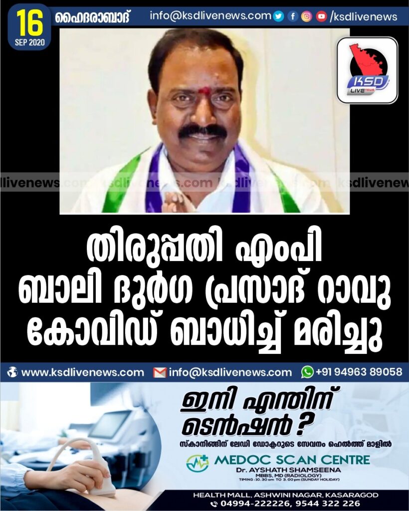 തിരുപ്പതി എംപി ബാലി ദുർഗ പ്രസാദ് റാവു കോവിഡ് ബാധിച്ച് മരിച്ചു