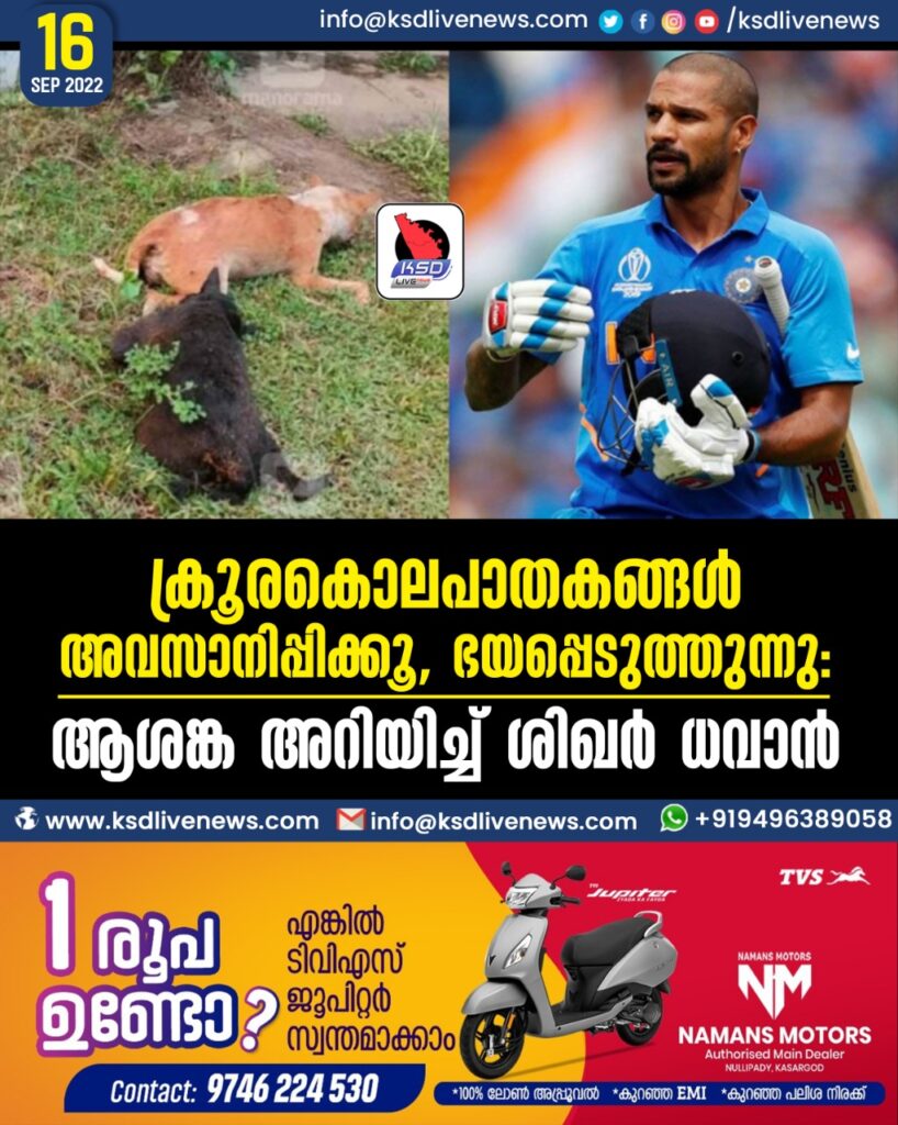 മുംബൈ∙ കേരളത്തിൽ തെരുവു നായ്ക്കളെ കൂട്ടത്തോടെ ചത്തനിലയിൽ കണ്ടെത്തിയ സംഭവത്തിൽ ആശങ്കയറിയിച്ച് ഇന്ത്യൻ ക്രിക്കറ്റ് താരം ശിഖർ ധവാൻ. കേരളത്തിൽ ഭയാനകമായ കാര്യങ്ങളാണു സംഭവിക്കുന്നതെന്നും ശിഖർ ധവാൻ ട്വിറ്ററിൽ കുറിച്ചു. ‘കേരളത്തിൽ നായ്ക്കളെ കൂട്ടത്തോടെ കൊല്ലുന്നതു ഭയപ്പെടുത്തുന്ന കാര്യമാണ്. ഇത്തരം നീക്കങ്ങൾ പുനഃപരിശോധിക്കണം’–ധവാൻ ട്വിറ്ററിൽ കുറിച്ചു.