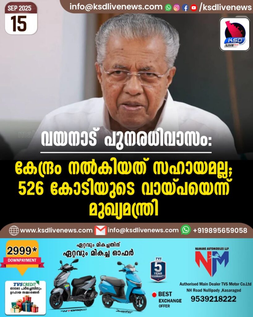 വയനാട് പുനരധിവാസം: കേന്ദ്രം നൽകിയത് സഹായമല്ല, 526 കോടിയുടെ വായ്പയെന്ന് മുഖ്യമന്ത്രി