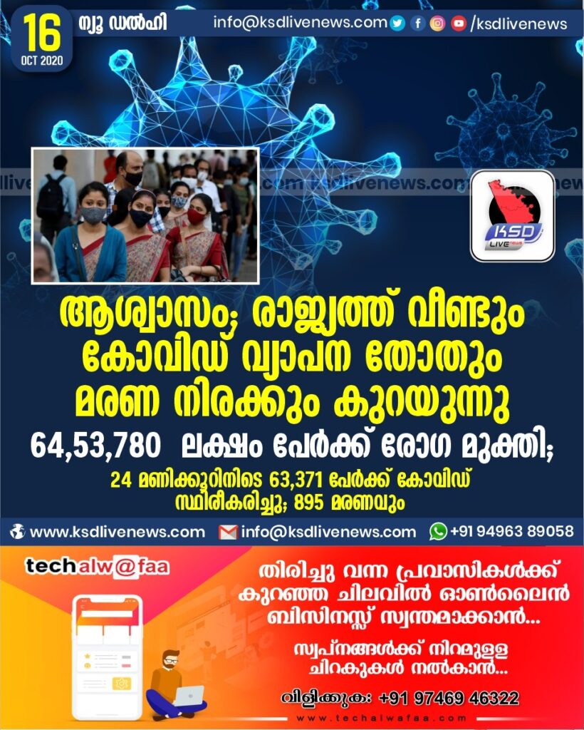 24 മണിക്കൂറിനിടെ 63,371 പേർക്ക് കോവിഡ് സ്ഥിരീകരിച്ചു ; 895 മരണവും