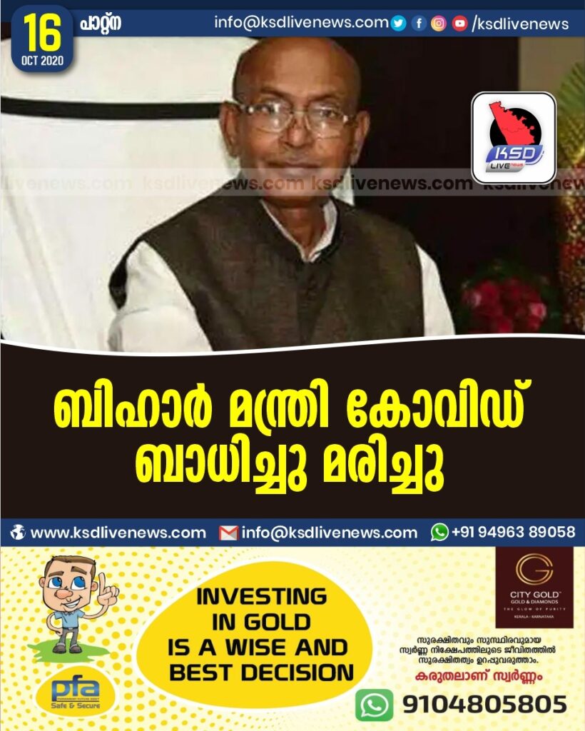 ബിഹാർ മന്ത്രി കോവിഡ് ബാധിച്ചു മരിച്ചു