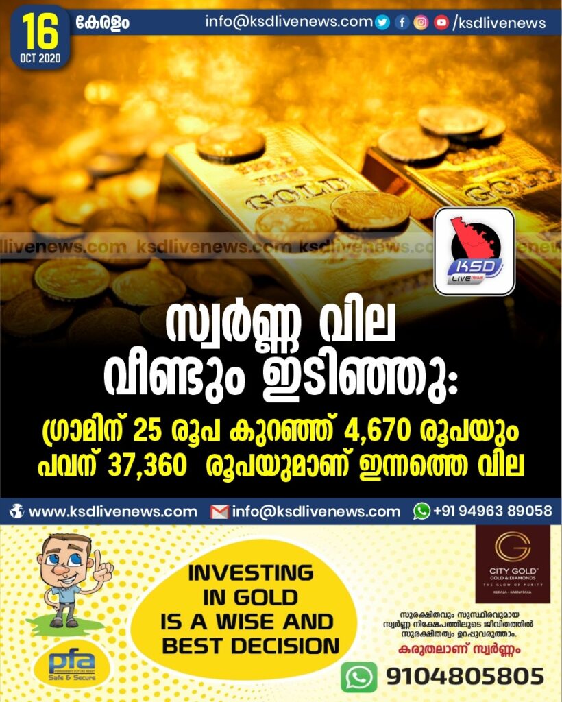 ഗ്രാമിന് 25 രൂപ കുറഞ്ഞ് 4,670 രൂപയും പവന് 37,360 രൂപയുമാണ് ഇന്നത്തെ വില