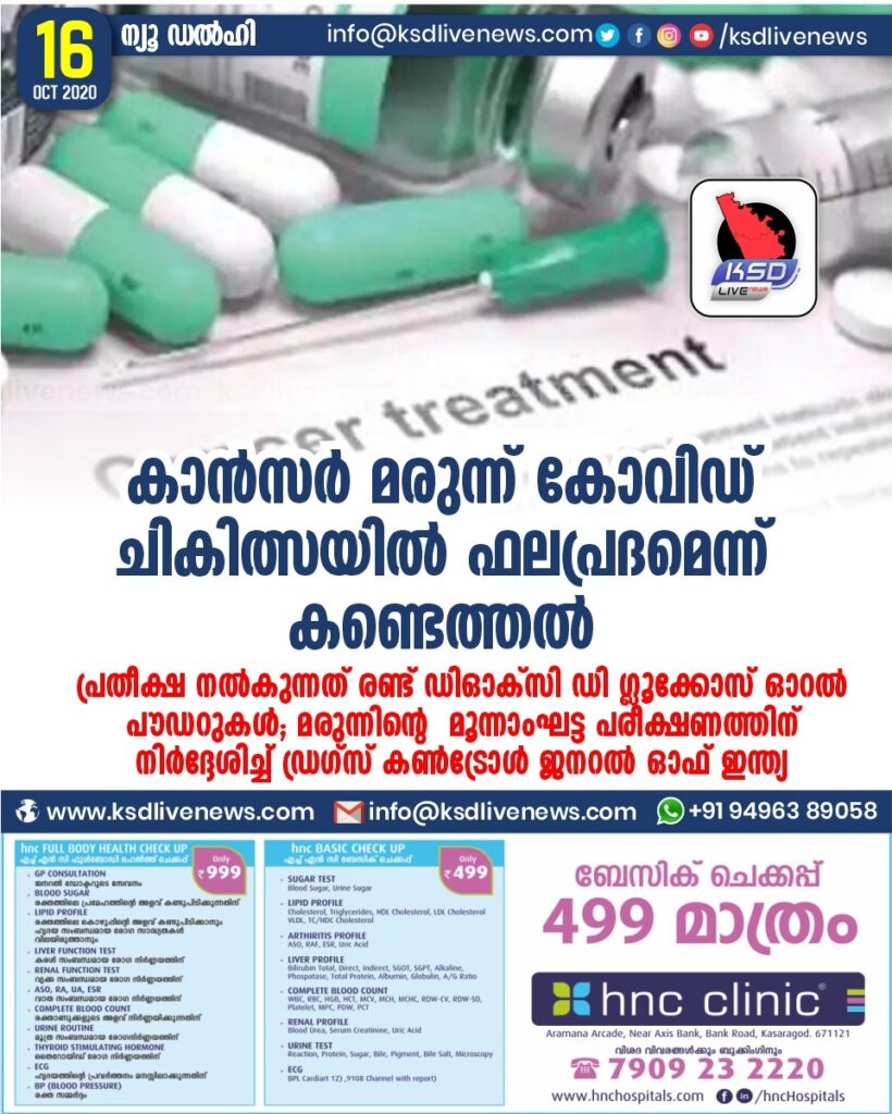 കാൻസർ മരുന്ന് കോവിഡ് ചികിത്സയിൽ ഫലപ്രദമെന്ന് കണ്ടെത്തൽ