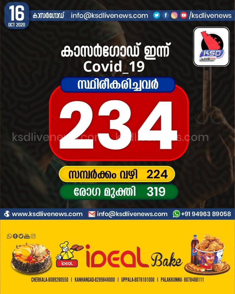 കാസർഗോഡ് ജില്ലയിൽ ഇന്ന് 234 പേർക്ക് കോവിഡ് സ്ഥിരീകരിച്ചു. സമ്പർക്കം വഴി 224 പേർക്കും. 319 പേർക്ക് രോഗ മുക്തി
