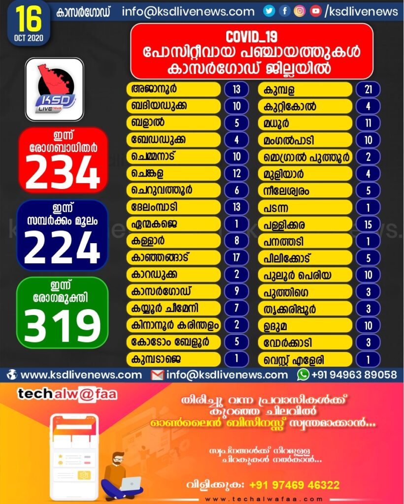 കാസർഗോഡ് ജില്ലയിൽ ഇന്ന് കോവിഡ് പോസിറ്റീവായവരുടെ പഞ്ചായത്ത് തിരിച്ചുള്ള സ്ഥിതി വിവര കണക്ക്