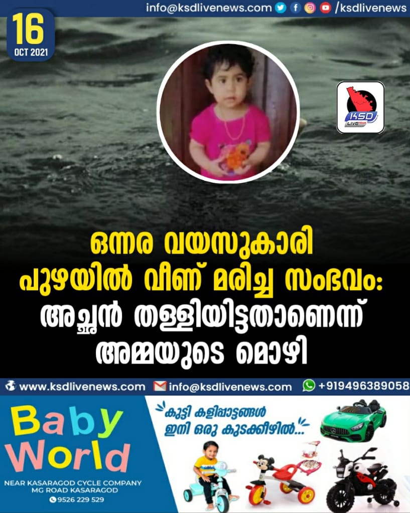 ഒന്നര വയസുകാരി പുഴയില്‍ വീണ് മരിച്ച സംഭവം: അച്ഛന്‍ തള്ളിയിട്ടതാണെന്ന് അമ്മയുടെ മൊഴി