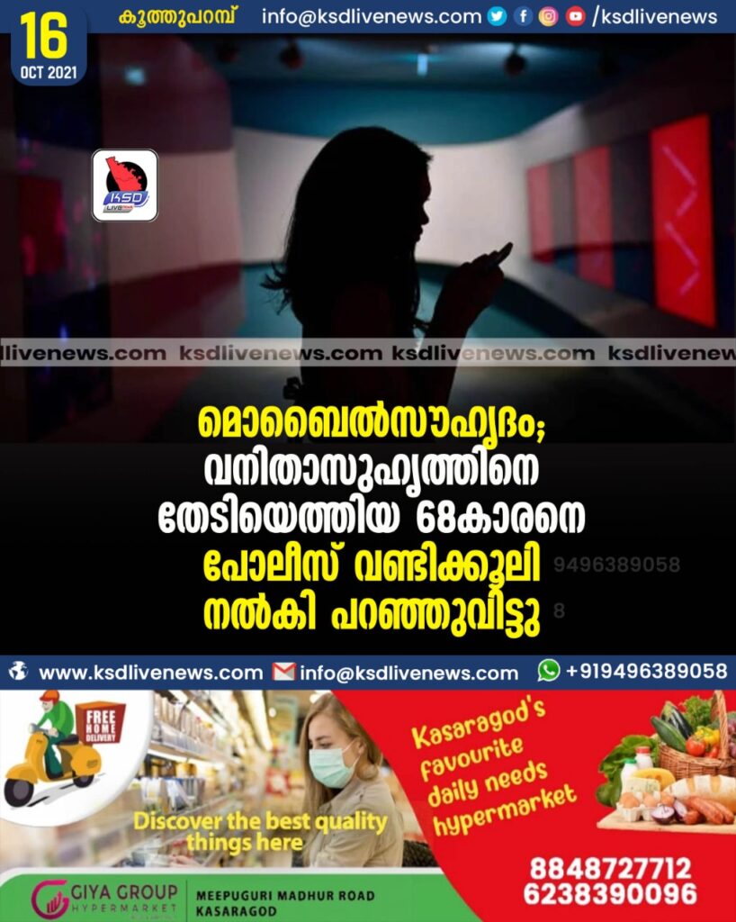 മൊബൈൽസൗഹൃദം: വനിതാസുഹൃത്തിനെ തേടിയെത്തിയ 68-കാരനെ പോലീസ് വണ്ടിക്കൂലി നൽകി പറഞ്ഞുവിട്ടു