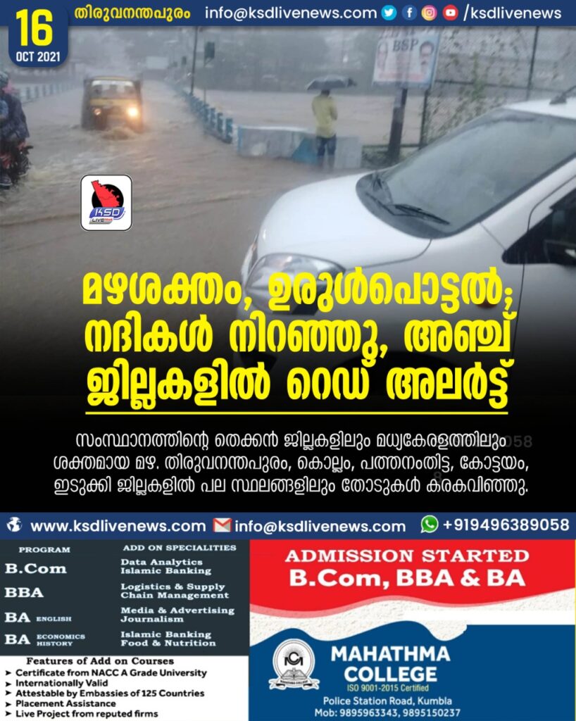 മഴശക്തം, ഉരുള്‍പൊട്ടല്‍, നദികള്‍ നിറഞ്ഞു, അഞ്ച് ജില്ലകളില്‍ റെഡ് അലര്‍ട്ട്‌