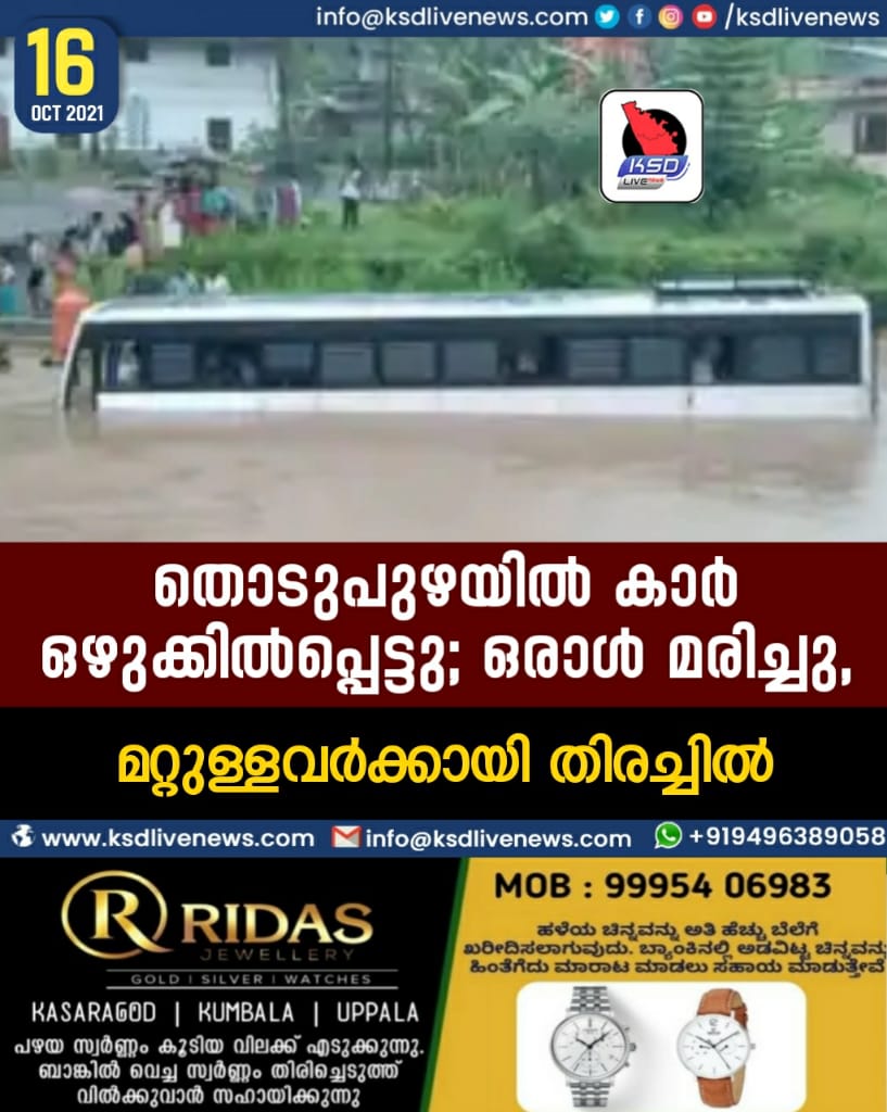 തൊടുപുഴയില്‍‌ കാർ ഒഴുക്കില്‍പ്പെട്ടു; ഒരാള്‍ മരിച്ചു, മറ്റുള്ളവർക്കായി തിരച്ചില്‍