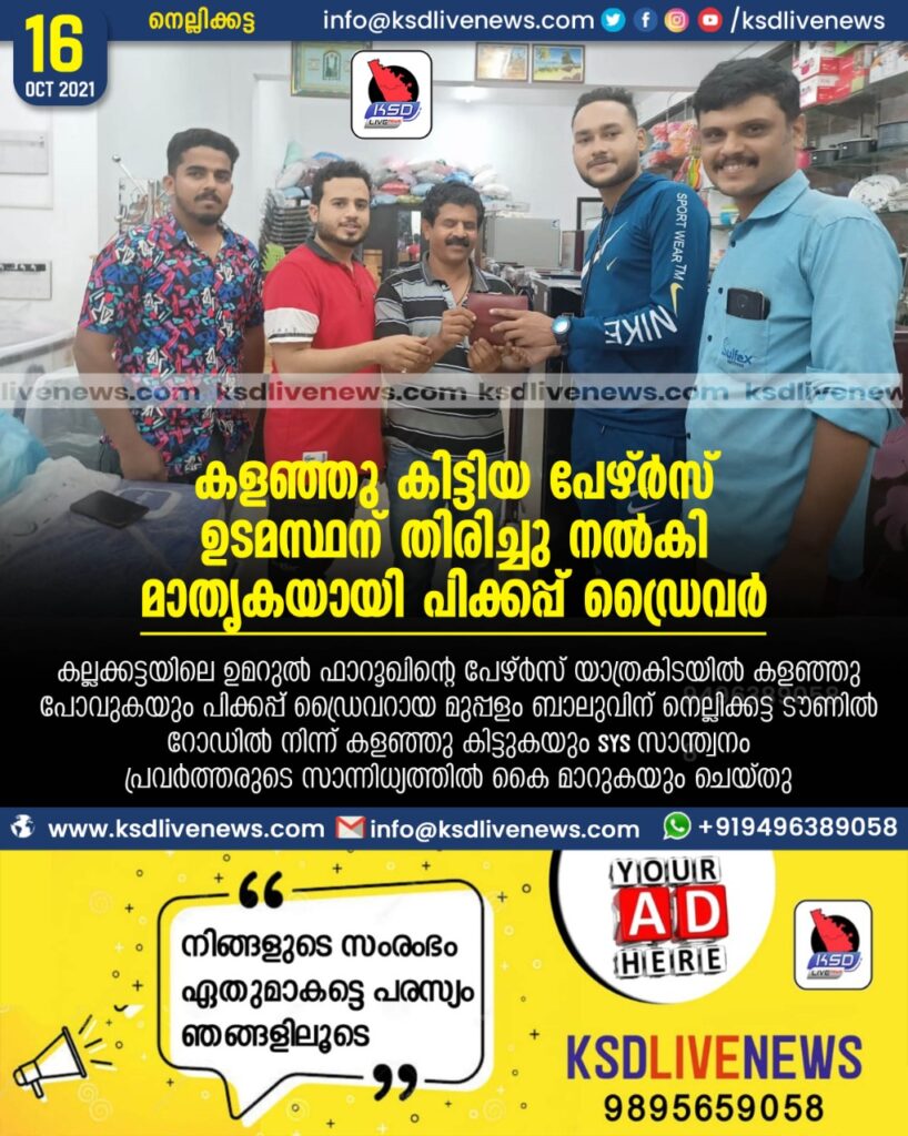 നെല്ലിക്കട്ട : കല്ലക്കട്ടയിലെ ഉമറുൽ ഫാറൂഖിന്റെ പേഴ്ർസ് യാത്രകിടയിൽ കളഞ്ഞു പോവുകയും ഒരു ദിവസം മുഴുവൻ തിരഞ്ഞു പ്രയാസത്തിൽ പെടുന്നതിനിടയിൽ പിക്കപ്പ് ഡ്രൈവറായ മുണ്ടപ്പളം ബാലുവിന് നെല്ലിക്കട്ട ടൗണിൽ റോഡിൽ നിന്ന് കളഞ്ഞു കിട്ടുകയും അത് എസ്.വൈ.എസ് സാന്ത്വനം പ്രവർത്തകരായ ഫൈസൽ നെല്ലിക്കട്ട, ബാഷ എന്നിവരെ ബന്ധപെട്ടു യഥാർത്ഥ ഉടമസ്ഥനെ കണ്ടത്തി അദ്ദേഹത്തിന് കൈ മാറി. എമിറേറ്റ്സ് ഐ.ഡി കാർഡ്, നാല് എ.ടി.എം കാർഡ്, ആധാർ കാർഡ്, പണവും മറ്റു വിലപിടിപ്പുള്ള രേഖകളും അടങ്ങിയ പേഴ്സ് ആയിരുന്നു. 23 വർഷമായി നെല്ലിക്കട്ടയിൽ ഡ്രൈവറായി ജോലി ചെയ്യുന്ന ബാലു മുണ്ടപ്പളം നിരവധി ഇങ്ങെനെയുള്ള മാതൃക പ്രവർത്തനം നടത്തിട്ടുണ്ട്.