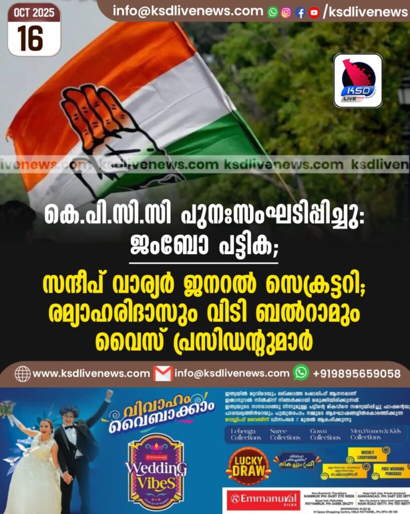 കെ.പി.സി.സി പുനഃസംഘടിപ്പിച്ചു: ജംബോ പട്ടിക; സന്ദീപ് വാര്യർ ജനറൽ സെക്രട്ടറി; രമ്യാഹരിദാസും വിടി ബൽറാമും വൈസ് പ്രസിഡന്റുമാർ