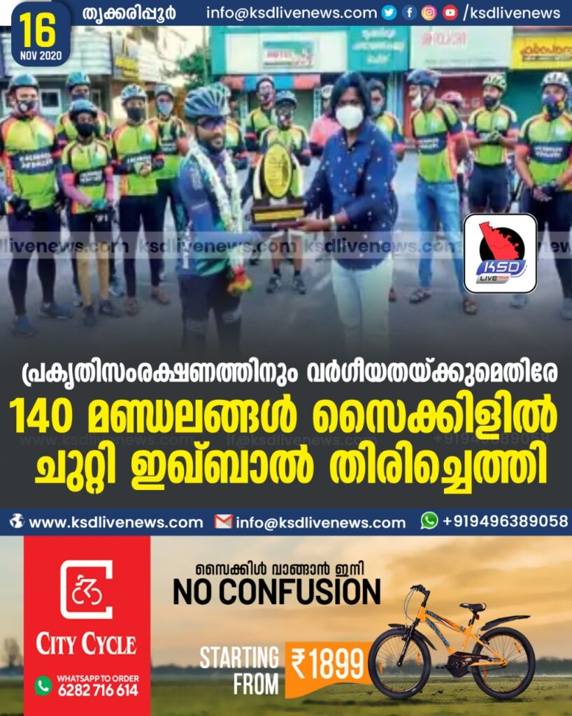 തൃക്കരിപ്പൂർ : പ്രകൃതിസംരക്ഷണത്തിനും വർഗീയതയ്ക്കുമെതിരേ കേരളത്തിലെ 140 നിയമസഭാ മണ്ഡലങ്ങളിൽ പര്യടനം നടത്തി മടങ്ങിയെത്തിയ ചെർക്കള സ്വദേശി സി.എ. മുഹമ്മദ് ഇഖ്ബാലിന് (42) ജില്ലാ അതിർത്തിയിൽ ഉജ്ജ്വല സ്വീകരണം. കാസർകോട് പെഡലേഴ്സ് നേതൃത്വത്തിലാണ് തൃക്കരിപ്പൂരിൽ പൗരസ്വീകരണം ഒരുക്കിയത്. ഒക്ടോബർ ഒന്നിന് ആരംഭിച്ച യാത്രയാണ് 46 ദിവസം കൊണ്ട് 4500 കിലോമീറ്റർ പിന്നിട്ട് ഞായറാഴ്ച മഞ്ചേശ്വരം മണ്ഡലത്തിൽ സമാപിച്ചത്. ഇഖ്ബാലിനെ സ്വീകരിക്കാൻ കണ്ണൂർ ജില്ലയിലെ പിലാത്തറമുതൽ കാസർകോടുവരെയുള്ള സൈക്ലിസ്റ്റുകൾ അതിരാവിലെ തൃക്കരിപ്പൂരിൽ എത്തിച്ചേർന്നു. കാസർകോട് പെഡലേഴ്സിന്റെ സ്വീകരണം നടൻ ഉണ്ണിരാജ് ചെറുവത്തൂർ ഉദ്ഘാടനം ചെയ്തു. പ്രസിഡന്റ് രതീഷ് അമ്പലത്തറ അധ്യക്ഷത വഹിച്ചു. വൈസ് പ്രസിഡന്റ് ബാബു മയൂരി, വി.എൻ. ശ്രീകാന്ത്, ടി.എം.സി. ഇബ്രാഹിം, മുഹമ്മദ് താജ് എന്നിവർ നേതൃത്വം നൽകി. കാഞ്ഞങ്ങാട് പുതിയ ബസ് സ്റ്റാൻഡിൽ ഹൊസ്ദുർഗ് എസ്.ഐ. വിനോദ് കുമാർ പൂമാല അണിയിച്ച് സ്വീകരിച്ചു. തൃക്കരിപ്പൂരിൽനിന്നും കാഞ്ഞങ്ങാട്ടുനിന്നും സൈക്ലിസ്റ്റുകൾ ഇഖ്ബാലിനെ മഞ്ചേശ്വരം വരെ അനുഗമിച്ചു. യാത്ര പൊസഡിഗുമ്പേയിൽ സമാപിച്ചു. അവിടെ ജില്ലാ കളക്ടർ ഡോ. ഡി. സജിത്ത് ബാബു സൈക്ലിസ്റ്റുകളെ സ്വീകരിച്ചു