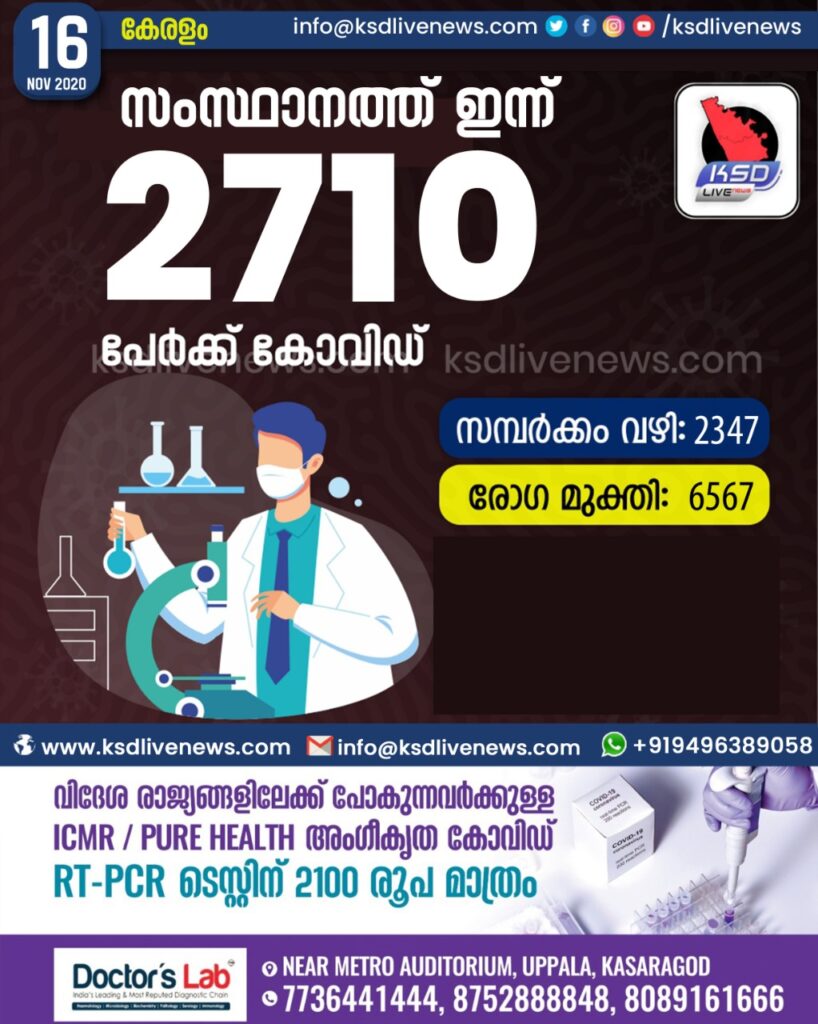 സംസ്ഥാനത്ത് ഇന്ന് 2710 പേർക്ക് കോവിഡ് സ്ഥിരീകരിച്ചു. സമ്പർക്കം വഴി 2347 പേർക്കും. രോഗമുക്തി 6567 പേർക്കും.