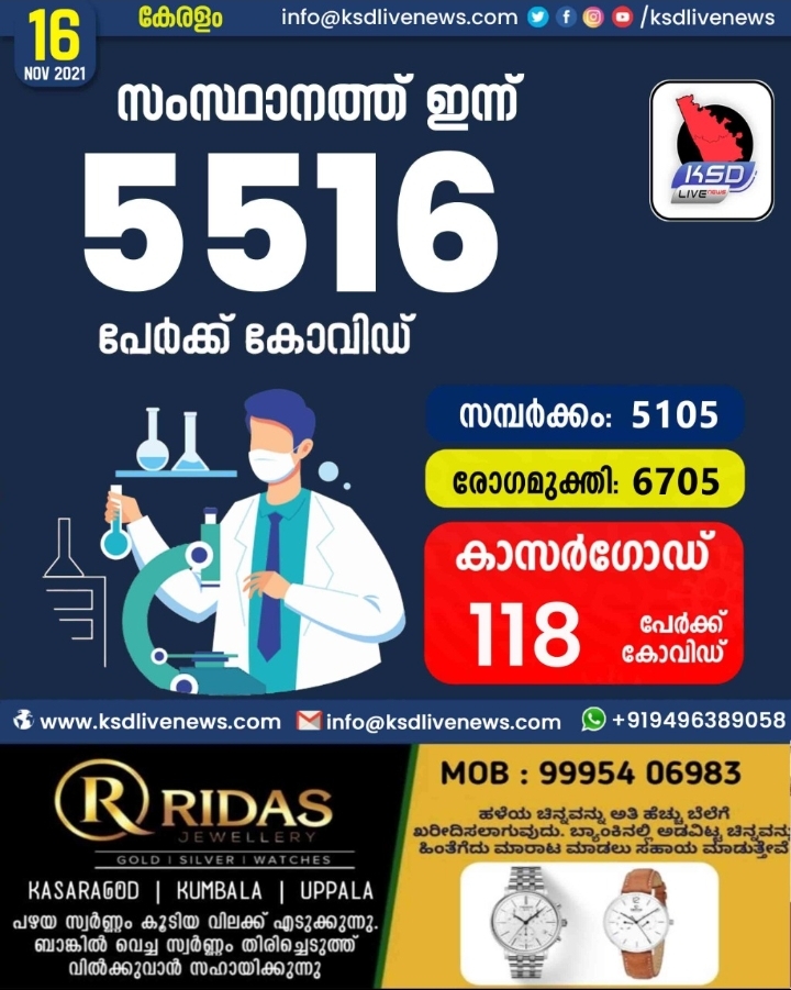സംസ്ഥാനത്ത് ഇന്ന് 5516 പേർക്ക് കോവിഡ് സ്ഥിരീകരിച്ചു. സമ്പർക്കം വഴി 5105 പേർക്കും ; ആശ്വാസമായി 6705 പേർക്ക് രോഗ മുക്തിയും ; കാസർഗോഡ് ജില്ലയിൽ 118 പേർക്ക് പുതിയ കോവിഡ് കേസുകൾ ; മരണം 39