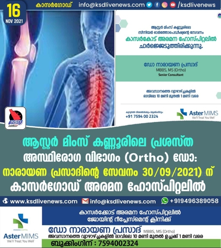 കണ്ണൂർ ആസ്റർ മിംസ് ഹോസ്പിറ്റലിലെ പ്രശസ്ത ഓർത്തോ വിഭാഗം തലവൻ ഡോക്ടർ നാരായണ പ്രസാദ് മാസത്തിലെ എല്ലാ അവസാന വ്യാഴാഴ്ചകളിലും 25/10/2021 വ്യാഴം10 മണി മുതൽ 1 മണി വരെ