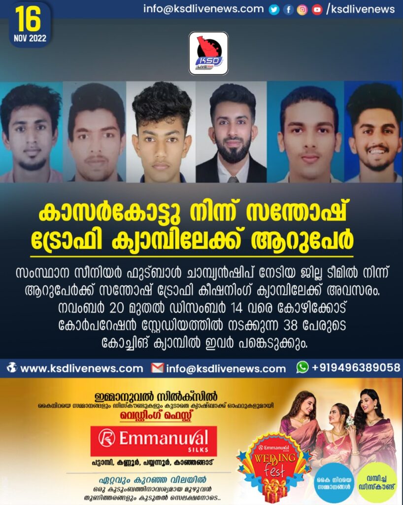 കാസർകോട്ടുനിന്ന് സന്തോഷ് ട്രോഫി ക്യാമ്പിലേക്ക് ആറുപേർ