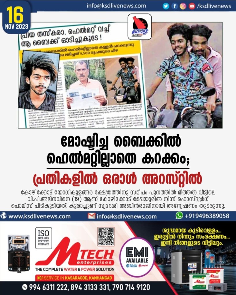 കാഞ്ഞങ്ങാട് ∙ മോഷ്ടിച്ച ബൈക്കുമായി റോഡ് ക്യാമറകൾക്കു മുന്നിലൂടെ ഹെൽമറ്റില്ലാതെ പാഞ്ഞ കള്ളന്മാരിൽ ഒരാൾ പൊലീസ് പിടിയിൽ. ബൈക്ക് കണ്ടെത്താനായില്ല. കോഴിക്കോട് യോഗികുളങ്ങര ക്ഷേത്രത്തിനു സമീപം പുനത്തിൽ മീത്തൽ വീട്ടിലെ വി.പി.അഭിനവിനെ (19) ആണ് കോഴിക്കോട് മേപ്പയൂരിൽനിന്നാണ് ഹൊസ്ദുർഗ് പൊലീസ് പിടികൂടിയത്. കൂരാച്ചുണ്ട് സ്വദേശി അബിൻരാജിനായി അന്വേഷണം തുടരുന്നു. ബൈക്ക് അബിൻ രാജിന്റെ കൈവശമാണെന്ന് അഭിനവ് പറയുന്നു. ബിഎംഎസ് മടിക്കൈ മേഖലാ വൈസ് പ്രസിഡന്റും പുതിയകോട്ടയിലെ ബിഎംഎസ് ചുമട്ടുതൊഴിലാളിയുമായ ഏച്ചിക്കാനം ചെമ്പിലോട്ടെ കെ.ഭാസ്കരന്റെ ബൈക്കാണ് മോഷണം പോയത്. മോഷ്ടാക്കൾ ഹെൽമറ്റില്ലാതെ ബൈക്ക് ഓടിച്ചതുവഴി 9,500 രൂപ പിഴ അടയ്ക്കാൻ ഭാസ്കരന് മോട്ടർവാഹന വകുപ്പിന്റെ നോട്ടിസ് ലഭിച്ചു. ഹെൽമറ്റ് ധരിക്കാത്തതിനാൽ റോഡ് ക്യാമറകളിൽ പ്രതികളുടെ ചിത്രം വ്യക്തമായി ലഭിച്ചു. ജൂൺ 27ന് കാഞ്ഞങ്ങാട്ട് ഒരു ഷോപ്പിങ് കോംപ്ലക്സിന്റെ പാർക്കിങ് ഏരിയയിൽ നിന്നാണ് ബൈക്ക് മോഷണം പോയത്. പിഴ അടയ്ക്കാൻ ഭാസ്കരന് നോട്ടിസ് ലഭിച്ചതോടെയാണ് പ്രതികളെക്കുറിച്ച് വിവരം ലഭിക്കുന്നത്. ഡിവൈഎസ്പി പി.ബാലകൃഷ്ണൻ നായർ, എസ്ഐ കെ.പി.സതീഷ്, സീനിയർ സിവിൽ പൊലീസ് ഓഫിസർമാരായ പ്രമോദ് കുമാർ, ഷൈജു, ഇബ്രാഹിം കുട്ടി എന്നിവരുടെ നേതൃത്വത്തിലാണ് പ്രതിയെ പിടികൂടിയത്
