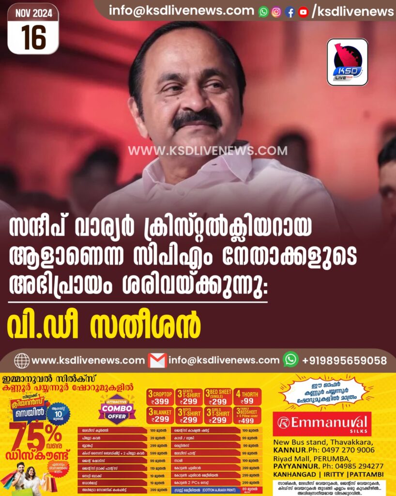 സന്ദീപ് വാര്യര് ക്രിസ്റ്റല്ക്ലിയറായ ആളാണെന്ന സിപിഎം നേതാക്കളുടെ അഭിപ്രായം ശരിവയ്ക്കുന്നു- സതീശൻ