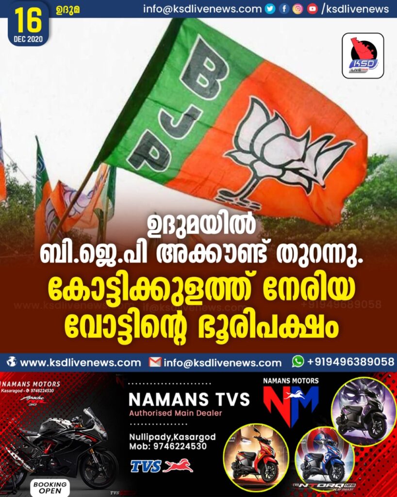 ഉദുമയിലെ രാഷ്ട്രീയ ചരിത്രം തിരുത്തിക്കുറിച്ചു കൊണ്ട് ഉദുമ ഗ്രാമപഞ്ചായത്തില് ബി.ജെ.പി അക്കൗണ്ട് തുറന്നു. ബേക്കല്, കോട്ടിക്കുളം തുടങ്ങിയ തീരദേശ വാര്ഡുകളാണ് ബി.ജെ.പി കോണ്ഗ്രസില് നിന്നും സീറ്റ് പിടിച്ചെടുത്തത്. ഇതോടെ യു.ഡി.എഫിന്റെ പ്രസക്തി ഉദുമയില് നഷ്ടടപ്പെടാനിടയായി. കോട്ടിക്കുളം വാര്ഡില് കേവലം ഒരു വോട്ടിനു മാത്രമാണ് ബി.ജെ.പി ജയം അറിഞ്ഞത്. മറു കക്ഷികള് റിവാല്യൂഷന് ആവശ്യപ്പെടാന് സാധ്യതയുണ്ട്. ബേക്കലില് 233 വോട്ടുകളുടെ ഭൂരിപക്ഷത്തിലാണ് അട്ടിമറി വിജയം നേടിയത്. ബേക്കലില് ഷൈനിയും, കോട്ടിക്കുളത്ത് വിനയകുമാറുമാണ് വിജയക്കൊടി പാറിച്ചത്