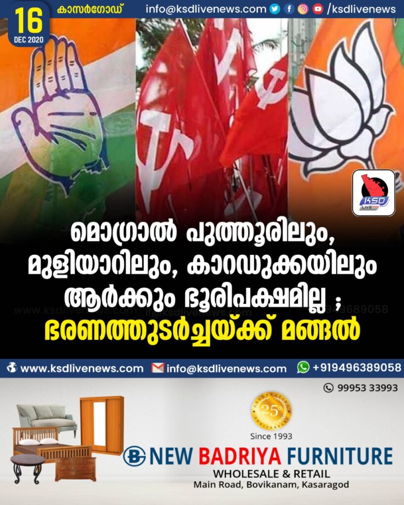 മൊഗ്രാൽ പുത്തൂരിലും, മുളിയാറിലും, കാറഡുക്കയിലും ആർക്കും ഭൂരിപക്ഷമില്ല ; ഭരണത്തുടർച്ചയ്ക്ക് മങ്ങൽ
