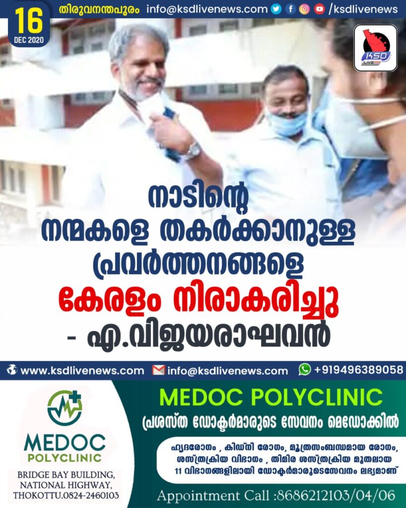 നാടിന്റെ നന്മകളെ തകർക്കാനുള്ള പ്രവർത്തനങ്ങളെ കേരളം നിരാകരിച്ചു – എ.വിജയരാഘവൻ