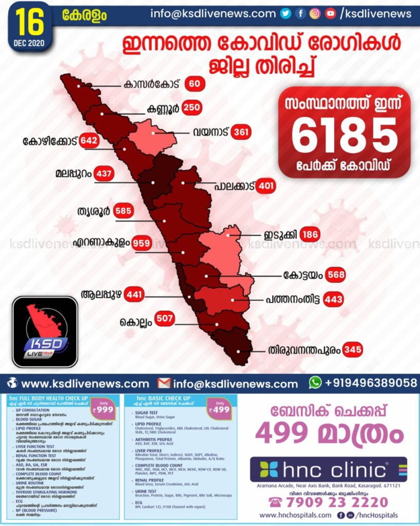 കേരളത്തിൽ ബുധനാഴ്ച 6185 പേർക്ക് കോവിഡ്-19 സ്ഥിരീകരിച്ചതായി മുഖ്യമന്ത്രി പിണറായി വിജയൻ അറിയിച്ചു. എറണാകുളം 959, കോഴിക്കോട് 642, തൃശൂർ 585, കോട്ടയം 568, കൊല്ലം 507, പത്തനംതിട്ട 443, ആലപ്പുഴ 441, മലപ്പുറം 437, പാലക്കാട് 401, വയനാട് 361, തിരുവനന്തപുരം 345, കണ്ണൂർ 250, ഇടുക്കി 186, കാസർഗോഡ് 60 എന്നിങ്ങനേയാണ് ജില്ലകളിൽ രോഗബാധ സ്ഥിരീകരിച്ചത്.