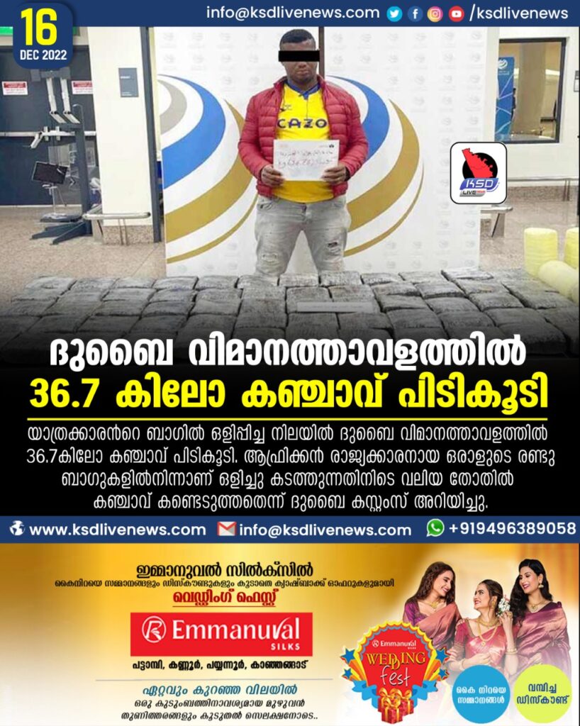 ദുബൈ വിമാനത്താവളത്തില് 36.7 കിലോ കഞ്ചാവ് പിടികൂടി