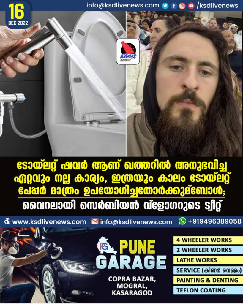 ‘ടോയ്ലറ്റ് ഷവര് ആണ് ഖത്തറില് അനുഭവിച്ച ഏറ്റവും നല്ല കാര്യം, ഇത്രയും കാലം ടോയ്ലറ്റ് പേപ്പര് മാത്രം ഉപയോഗിച്ചതോര്ക്കുമ്ബോള്.’ വൈറലായി സെര്ബിയന് വ്ളോഗറുടെ ട്വീറ്റ്