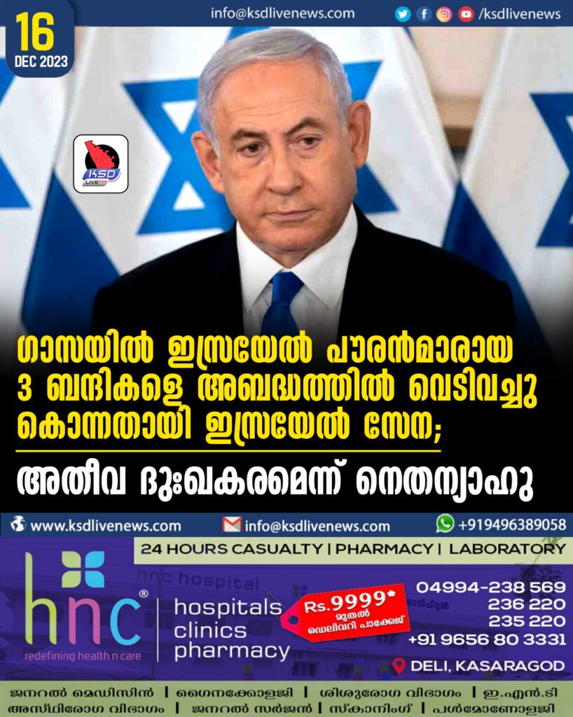 ഗാസയിൽ ഇസ്രയേൽ പൗരൻമാരായ 3 ബന്ദികളെ അബദ്ധത്തിൽ വെടിവച്ചു കൊന്നതായി ഇസ്രയേൽ സേന; അതീവ ദുഃഖകരമെന്ന് നെതന്യാഹു
