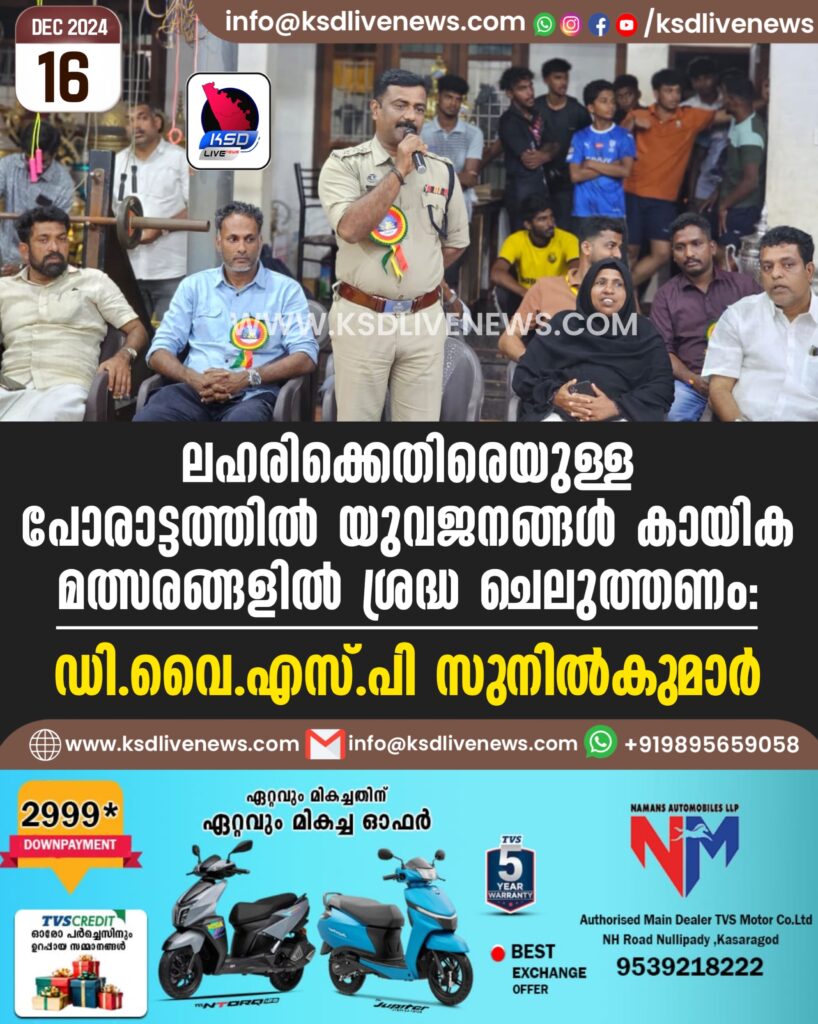 ലഹരിക്കെതിരെയുള്ള പോരാട്ടത്തിൽ യുവജനങ്ങൾ കായിക മത്സരങ്ങളിൽ ശ്രദ്ധ ചെലുത്തണം, ഡിവൈഎസ്പി സുനിൽകുമാർ