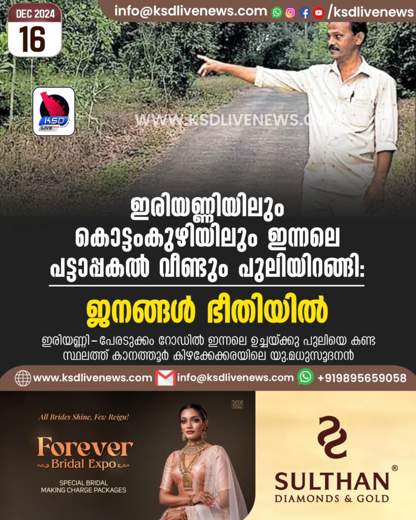 കാറഡുക്ക പഞ്ചായത്തിലെ കൊട്ടംകുഴി ഒയക്കോലിൽ ട്യൂഷൻ കഴിഞ്ഞ് വീട്ടിലേക്കു തിരിച്ചുപോവുകയായിരുന്ന പ്ലസ് ടു വിദ്യാർഥിനി 3 പുലികളെയാണ് ഒരുമിച്ചു കണ്ടത്. ഒയക്കോലിലെ വിനോദിന്റെ മകൾ അതുല്യയ്ക്കു മുന്നിലേക്കാണ് ഒരു ചെറുതുൾപ്പെടെ 3 പുലികളെത്തിയത്.ടാറിങ് റോഡിൽ നിന്ന് ഇടവഴിയിലൂടെ നടന്നാണ് ഇവരുടെ വീട്ടിലേക്കു പോകേണ്ടത്.