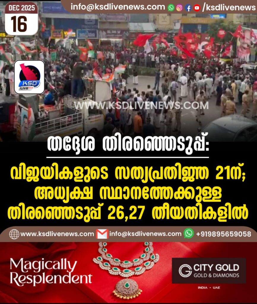 തദ്ദേശ തിരഞ്ഞെടുപ്പ്: വിജയികളുടെ സത്യപ്രതിജ്ഞ 21ന്; അധ്യക്ഷ സ്ഥാനത്തേക്കുള്ള തിരഞ്ഞെടുപ്പ് 26,27 തീയതികളിൽ