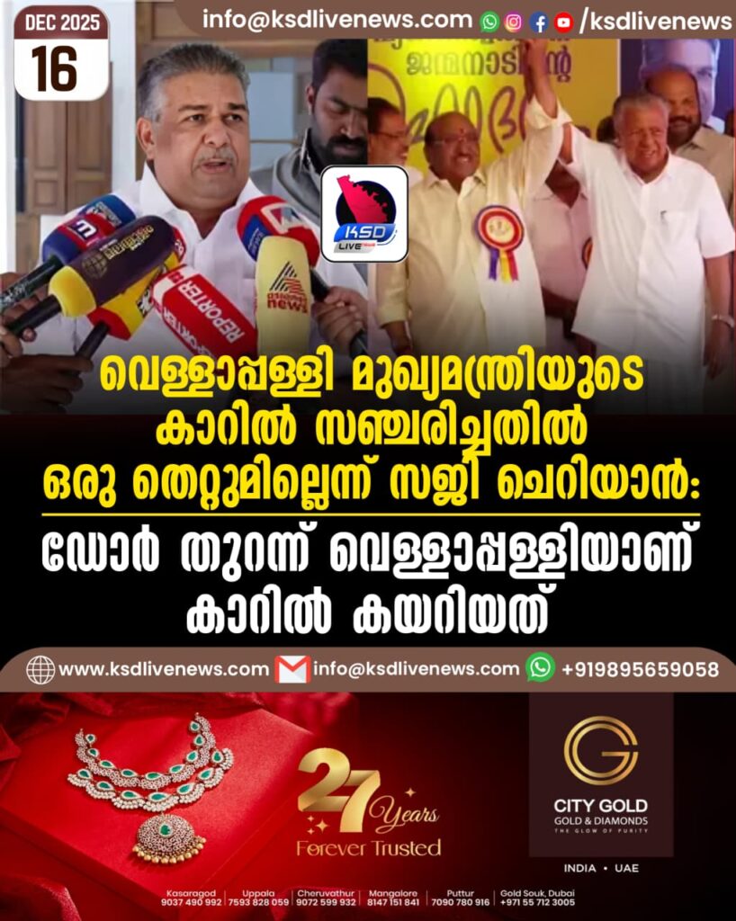 വെള്ളാപ്പള്ളി മുഖ്യമന്ത്രിയുടെ കാറിൽ സഞ്ചരിച്ചതിൽ ഒരു തെറ്റുമില്ലെന്ന് സജി ചെറിയാൻ: ഡോർ തുറന്ന് വെള്ളാപ്പള്ളിയാണ് കാറിൽ കയറിയത്