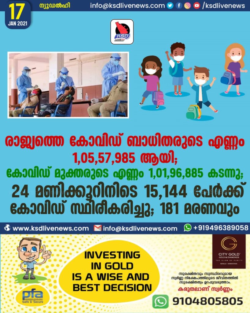 രാജ്യത്തെ കോവിഡ് ബാധിതരുടെ എണ്ണം 1,05,57,985 ആയി ; കോവിഡ് മുക്തരുടെ എണ്ണം 1,01,96,885 കടന്നു ;