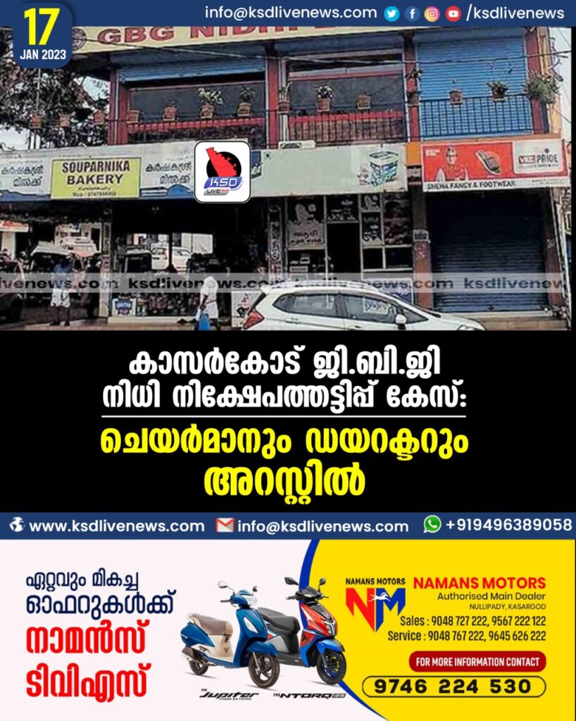 കാസർകോട് ജിബിജി നിധി നിക്ഷേപത്തട്ടിപ്പ് കേസ്: ചെയർമാനും ഡയറക്ടറും അറസ്റ്റിൽ